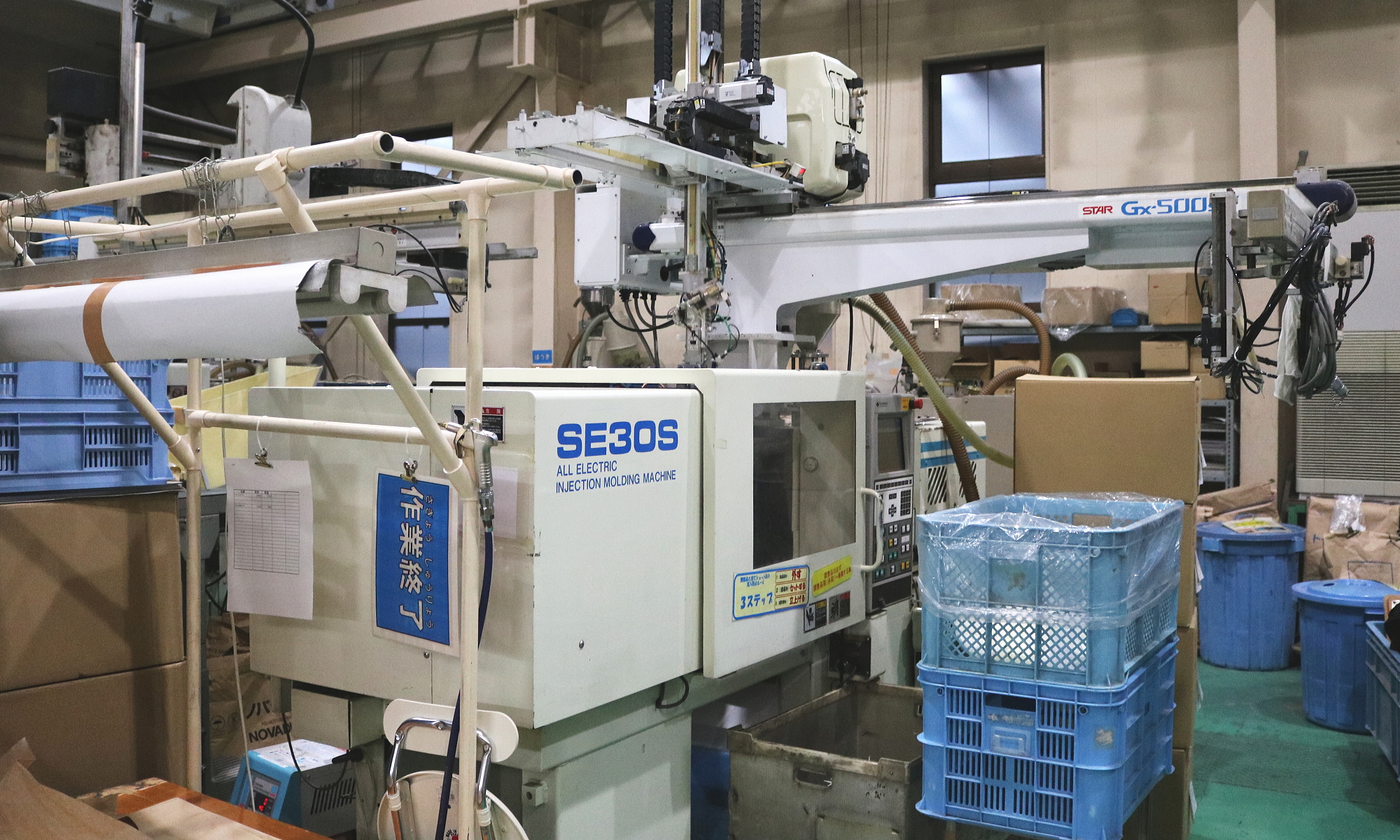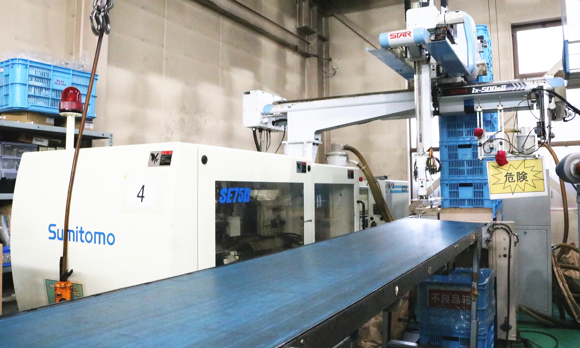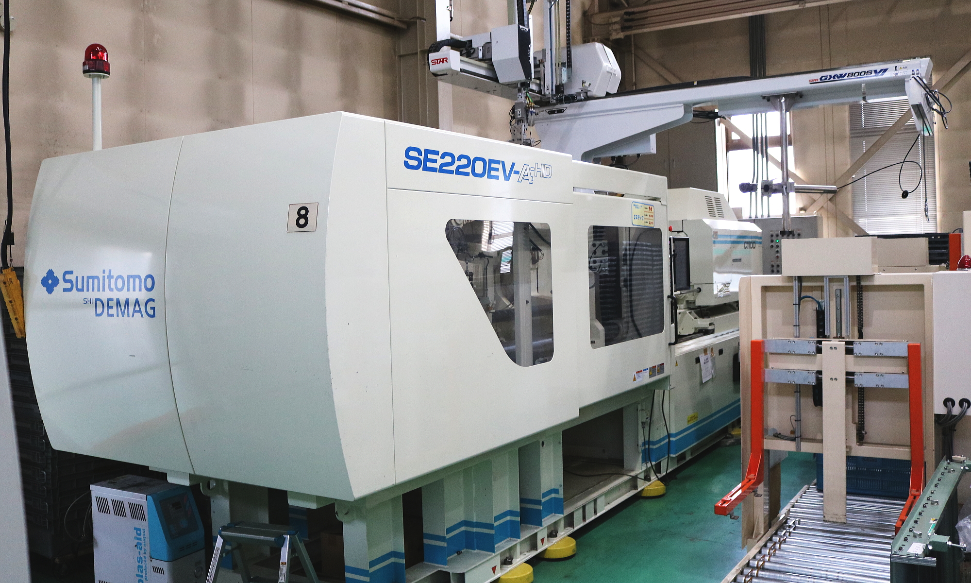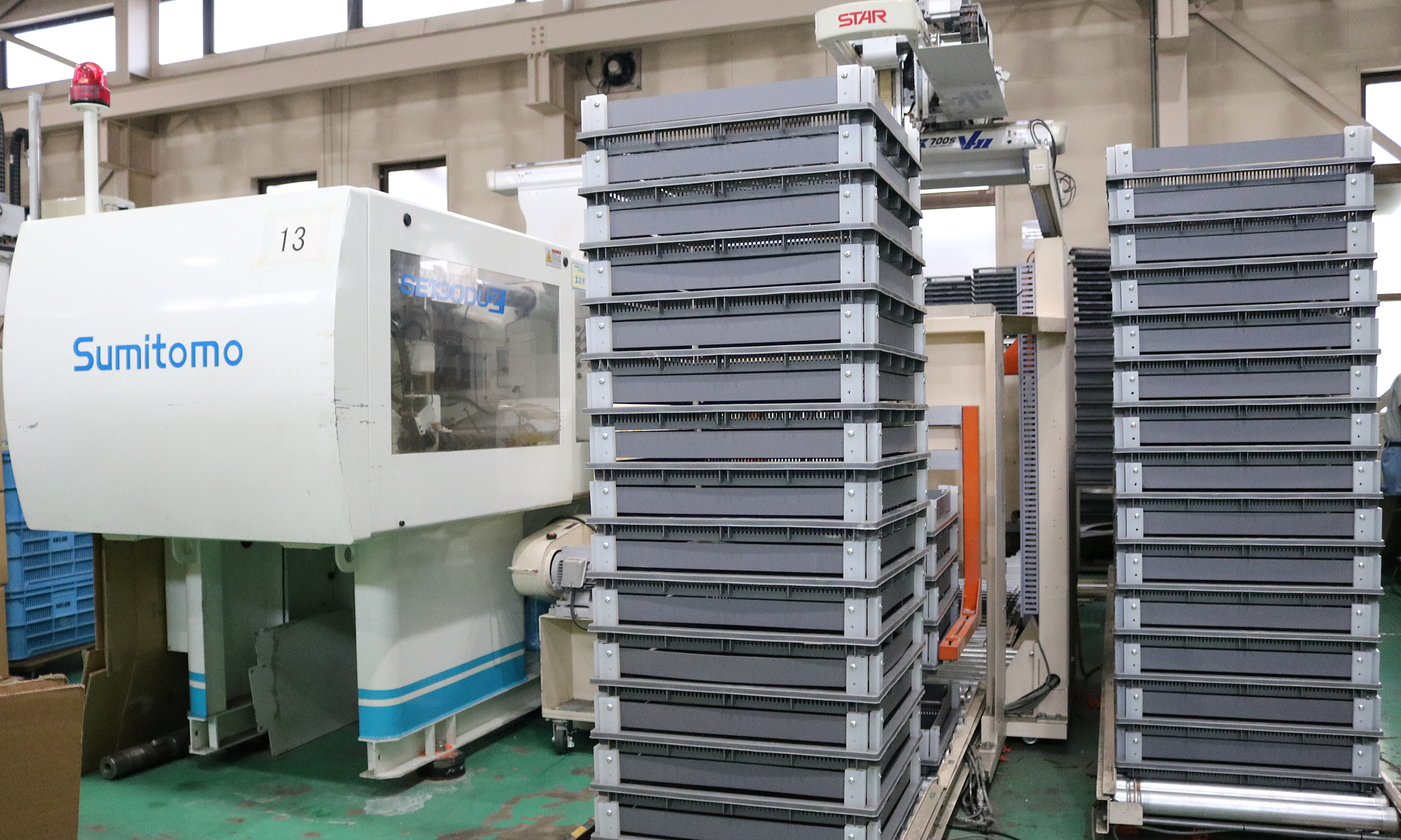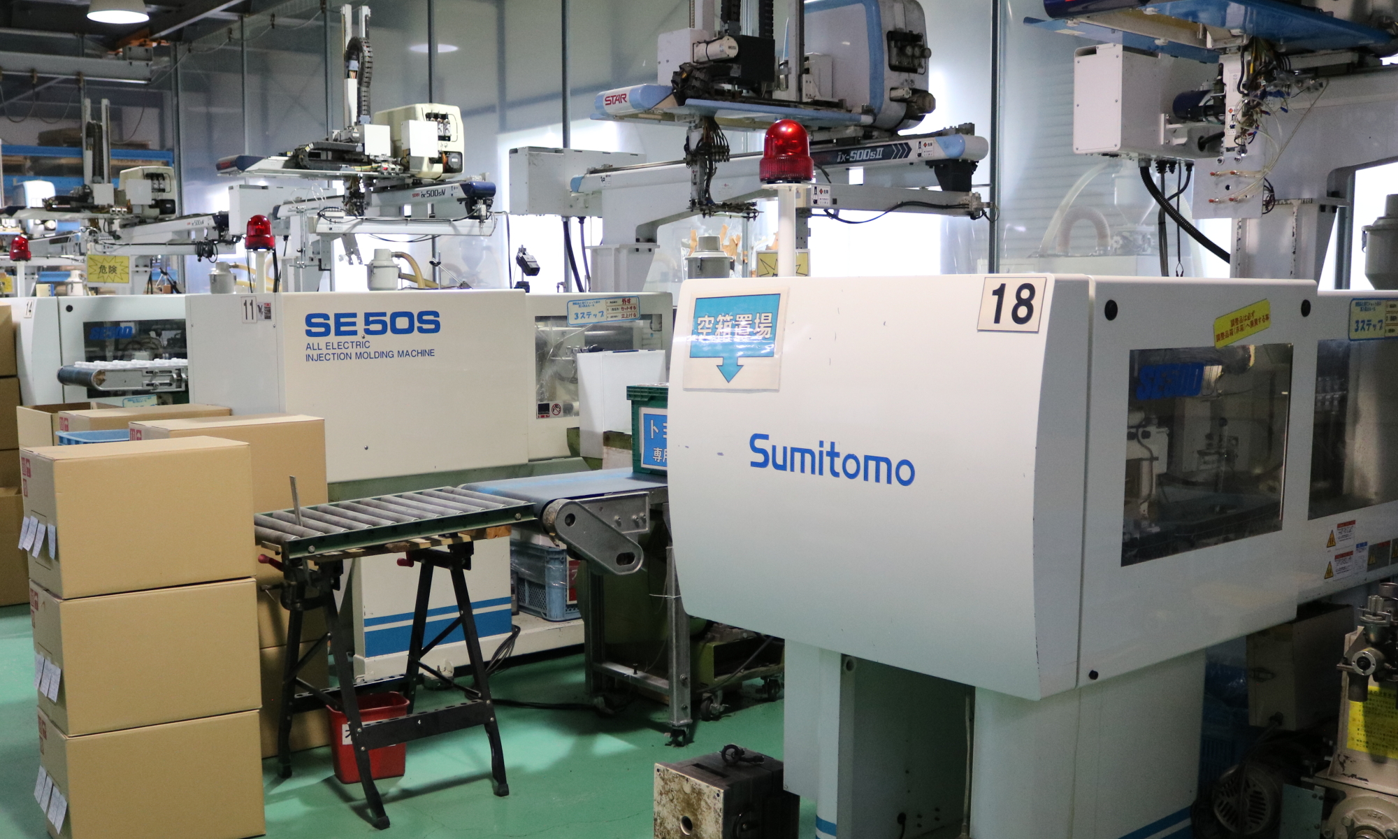 住友重機械工業のSE130DUZを1台導入しています。スター精機製の自動取出機により、効率的な生産を行っています。