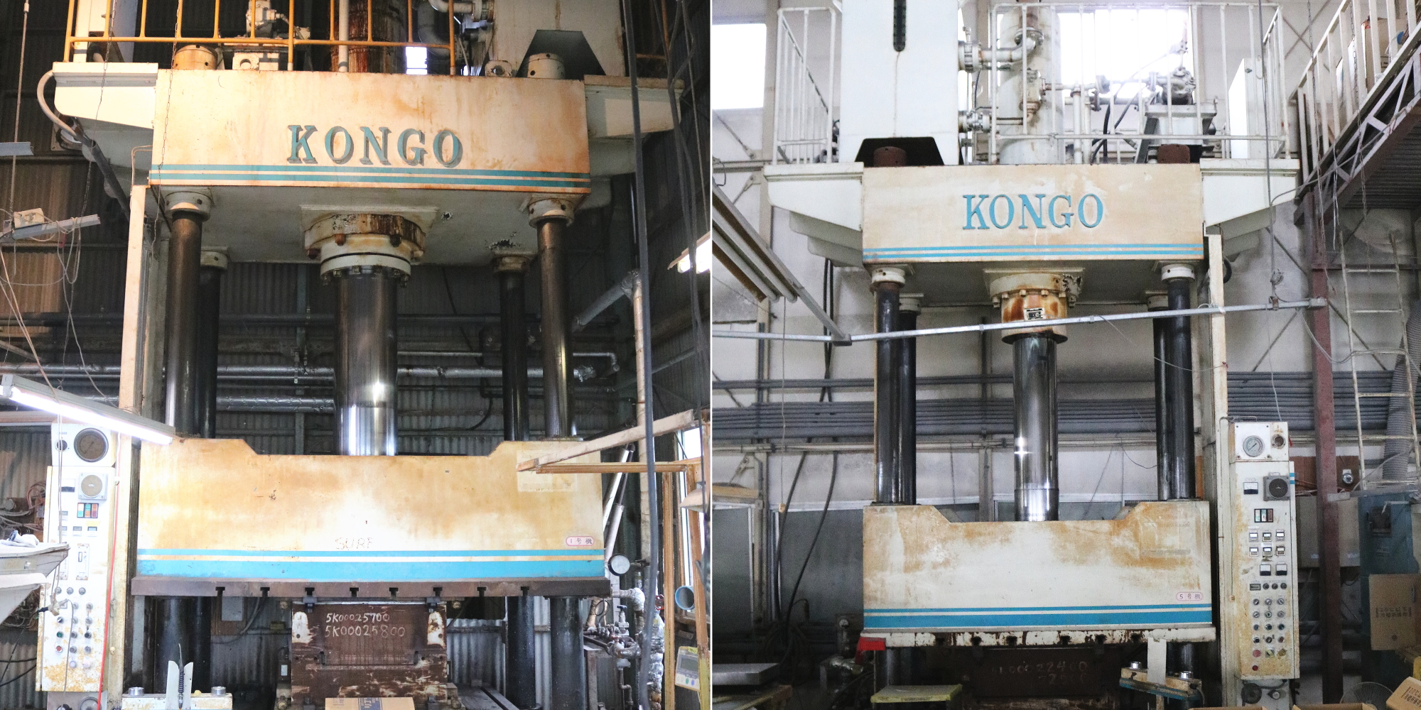 KONGOブランドの油圧プレス機を5台保有しています。用途に応じて300トン、200トン(2台)、150トン、100トンを使い分けしております。